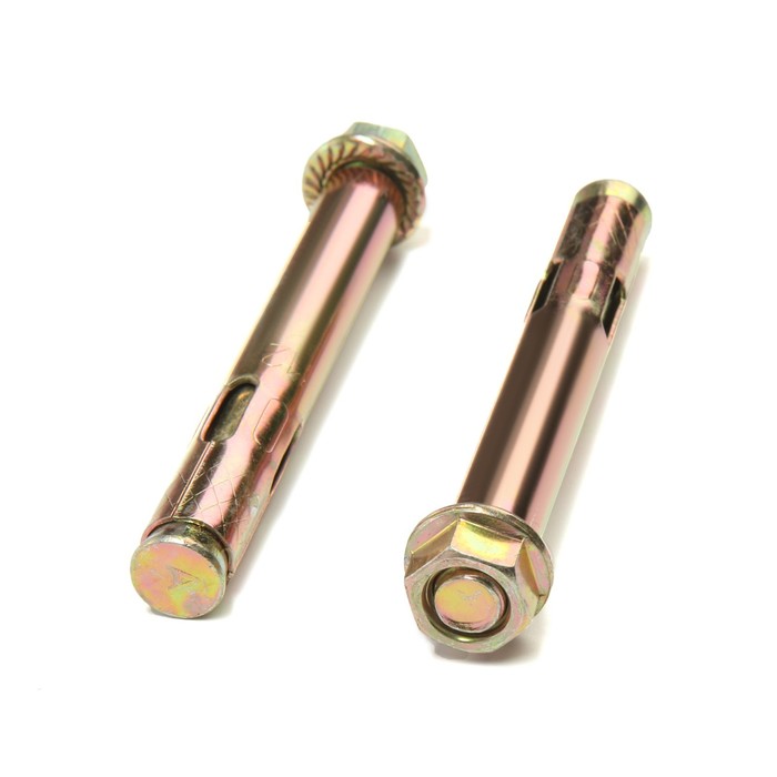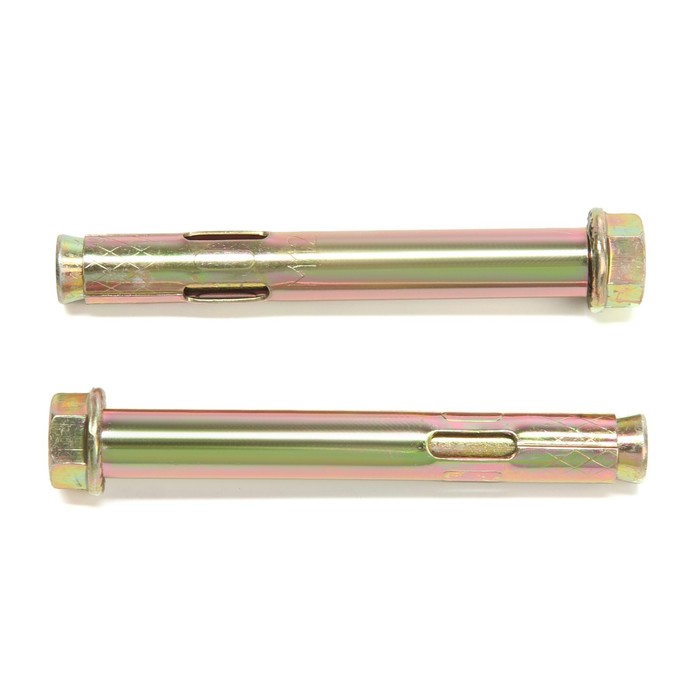 Анкер состоит из шпильки с метрической резьбой с одной стороны и конусообразным элементом с другой, цилиндрической распорной втулки, шестигранной гайки с фланцем.