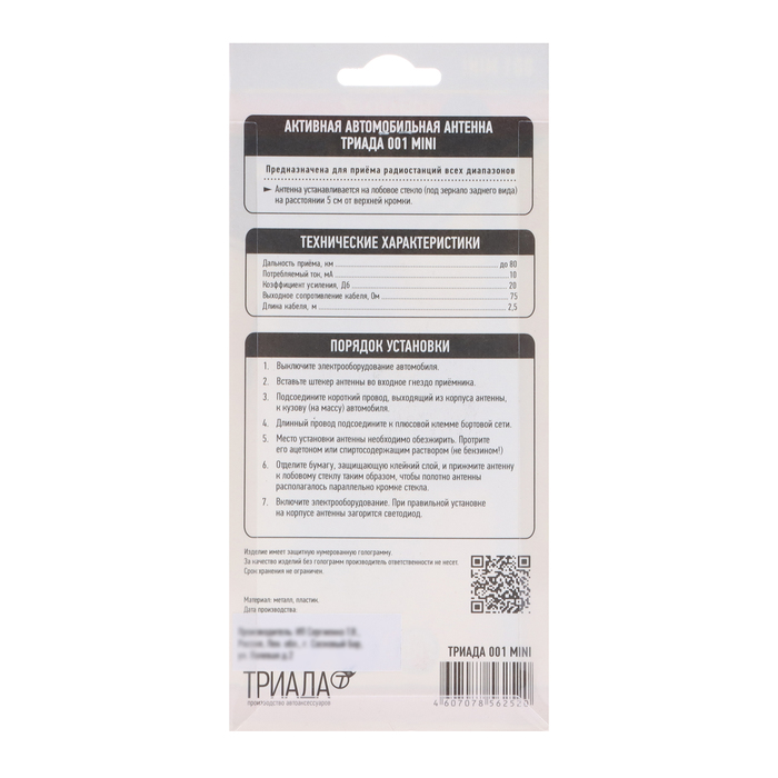 Предназначена для приема радиоволн УКВ, FM в условиях города. Основное преимущество – компактная конструкция и небольшая цена. Хорошо работает на небольших расстояниях от радиовещательных станций. Рекомендуется потребителям, эксплуатирующим автомобиль в основном в пределах города, которые не хотят переплачивать. Если требуется регулировать усиление для уменьшения промышленных и радиопомех вблизи от передающих станций, советуем обратить внимание на антенны ""Триада-002 Mini"".