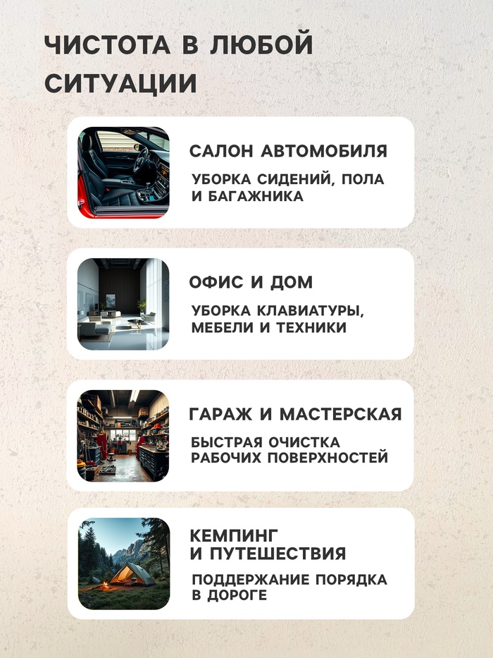 - Мощность 120 Вт и 5 универсальных насадок позволяют собрать пыль, песок, пепел даже из самых труднодоступных мест салона.