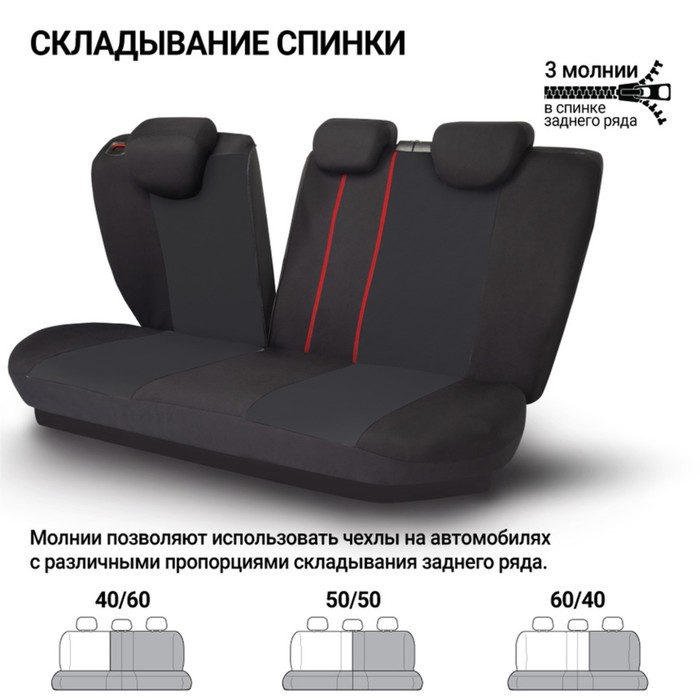 Универсальный размер подходит большинству автомобильных сидений. Есть специальный распускаемый шов для боковых подушек Airbag на передних сиденьях. Молнии в спинке заднего ряда разработаны для модульных сидений с секциями 40:60, 50:50, 60:40.