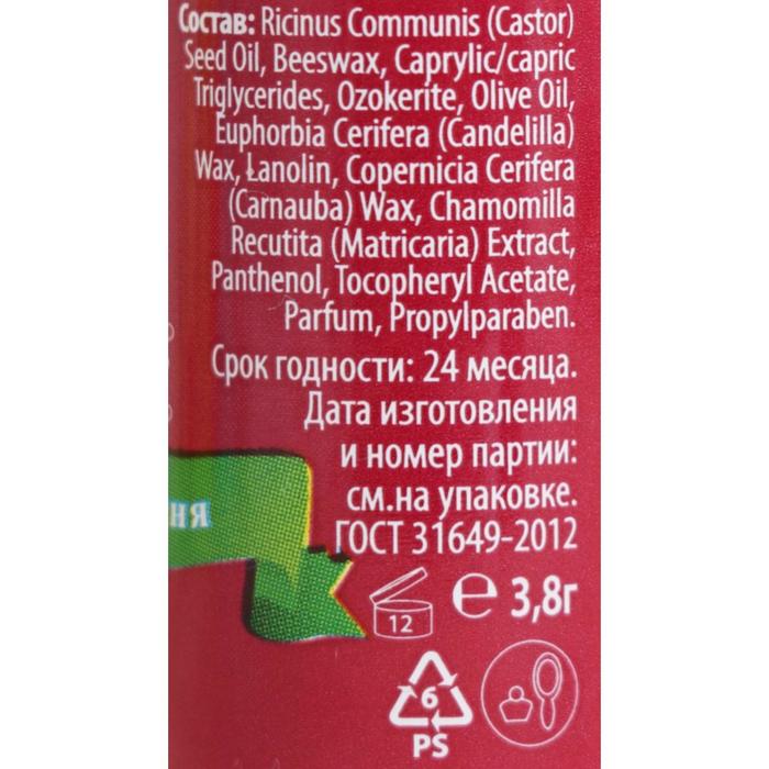 Гигиеническая помада с ароматами любимых ягод и фруктов. Содержит натуральные компоненты, которые бережно и эффективно смягчают и защищают губы. Активные компоненты: пчелиный воск, оливковое масло, экстракт ромашки, пантенол, касторовое масло, витамин Е, ланолин. Губы увлажнены и защищены от воздействия ветра или мороза.