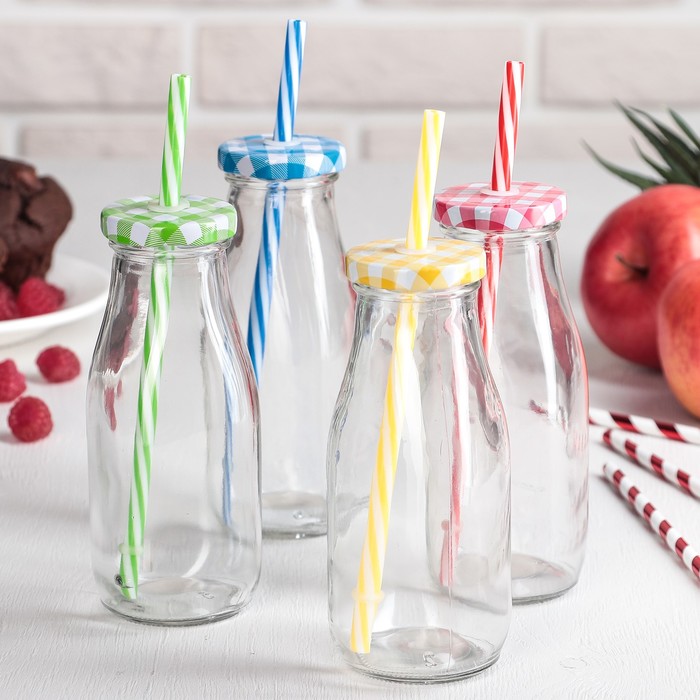 Бутыль стеклянная с крышкой и трубочкой «Лаконичность», 300 мл, 6,5×15,5 см, цвет МИКС