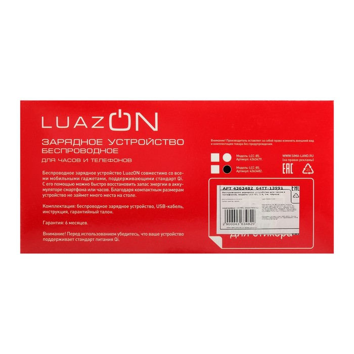 Беспроводное зарядное устройство LuazON для часов и телефонов, модель LCC-85, 2A, 1м, чёрное