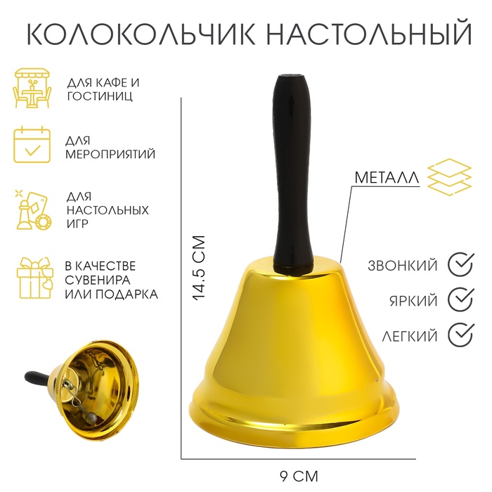 Вам нравятся яркие и оригинальные аксессуары? Вы любите громко заявить о себе? Настольный колокольчик золотого цвета разработан специально для вас. Это отличный сувенир для тех, кто любит быть в центре внимания. Длинная ручка выполнена из пластика, а основание — из металла, что делает колокольчик очень лёгким, звонким и удобным в использовании.