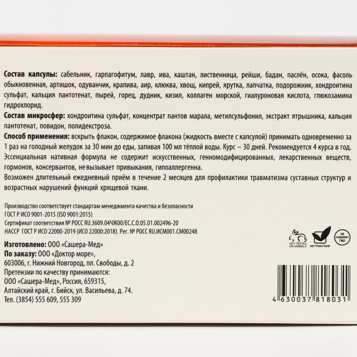 <strong>Состав микросфер:</strong> хондроитинсульфат, концентрат пантов марала, метилсульфоний, экстракт ятрышника, кальций пантотенат, повидон, полидекстроза.