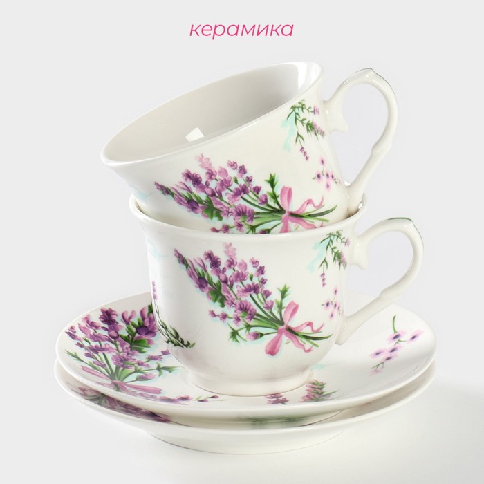 Сервиз фарфоровый чайный Доляна «Лаванда», 4 предмета: 2 чашки 220 мл, 2 блюдца d=14,2 см, цвет белый