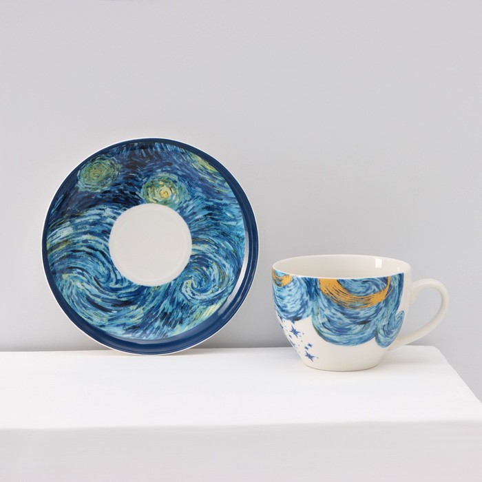 Серия посуды «Звездная ночь» вдохновлена полотнами Винсента Ван Гога. Она выполнена из фарфора с изображением предрассветного неба. Невероятно приятная, контрастная цветовая комбинация шедевра воодушевляет и завораживает. Такая посуда станет украшением обеденного стола, а также замечательным подарком.