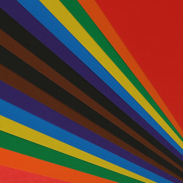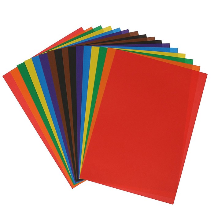 16 листов (8 цветов) цветной бумаги из качественно прокрашенной офсетной бумаги плотностью 70г/м2 упакованы в папке на 2 клапана из высококачественного мелованного картона плотностью 200г/м2. Честный размер А4 формата - 210 x 297мм.