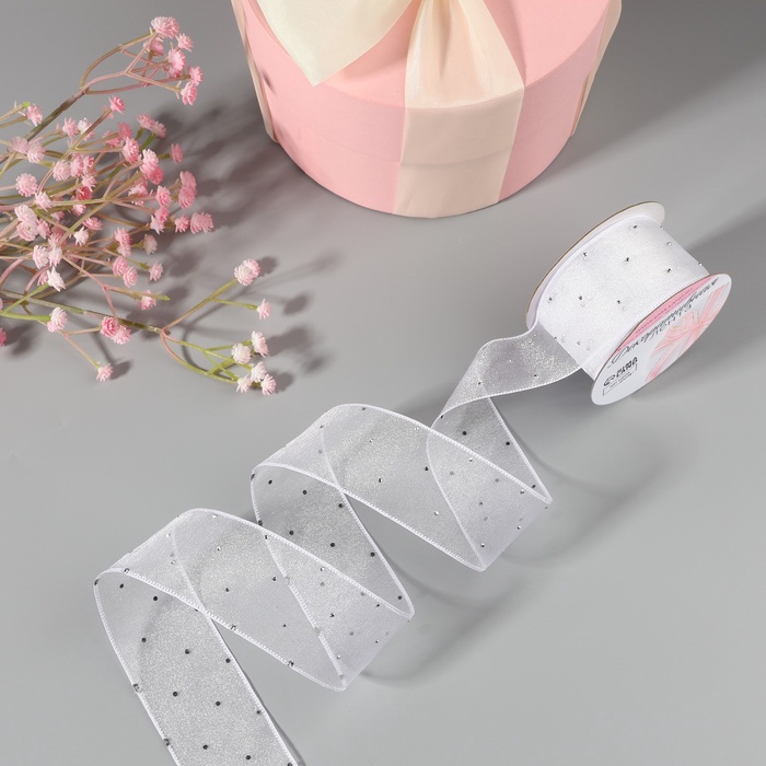 Лента декоративная, с глиттером, 38 мм, 9 ± 0,5 м, цвет белый/серебряный