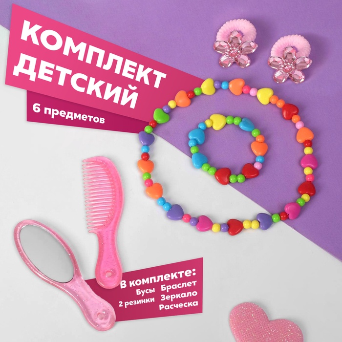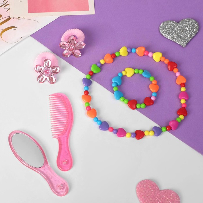Набор детский "Выбражулька" 5 предметов: 2 заколки, бусы, браслет, кольцо, бантик с сердечком, цвет розовый