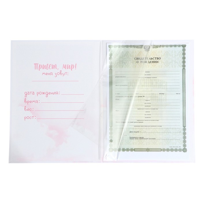 Папка под свидетельство о рождении формата А4 имеет удобный файл внутри, который защитит первый в жизни документ малыша от повреждений.