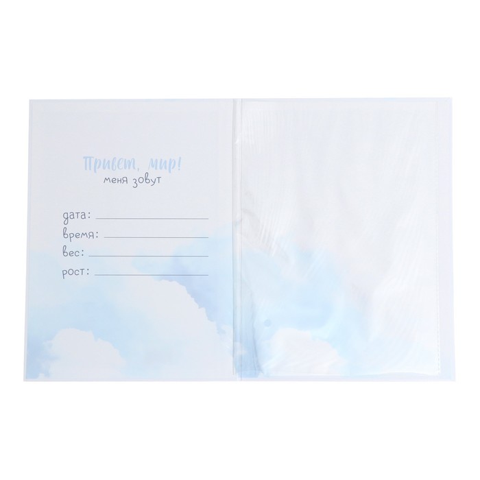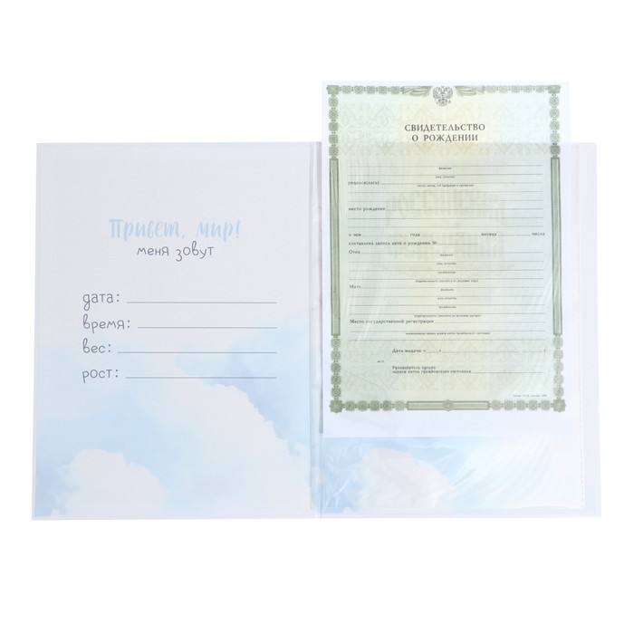 Папка под свидетельство о рождении формата А4 имеет удобный файл внутри, который защитит первый в жизни документ малыша от повреждений.