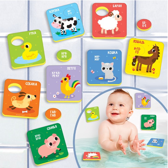 Забавные игрушки из мягкого материала не тонут в воде и при намокании приклеиваются к кафелю или ванне.