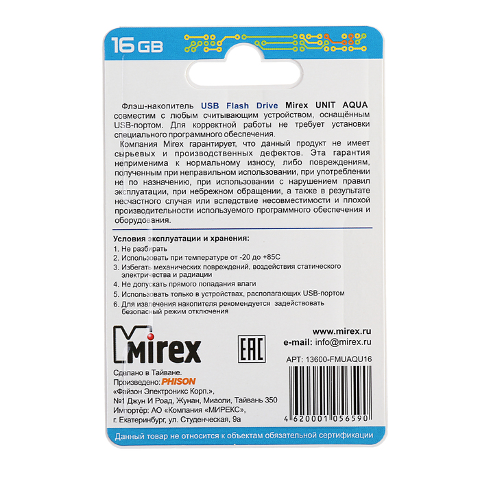 Флешка Mirex UNIT AQUA, 16 Гб, USB2.0, чт до 25 Мб/с, зап до 15 Мб/с, синяя