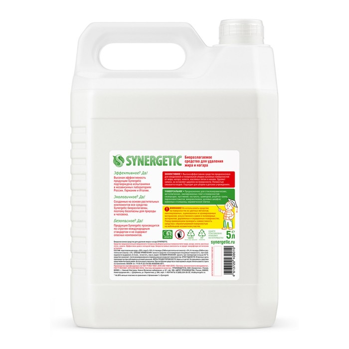 Высокоэффективное щелочное средство, цель которого — разъедать серьёзные органические загрязнения. Жир, нагар, копоть — ничто не ускользнёт от активного геля SYNERGETIC. Лучший помощник каждой хозяйки для очистки плит, духовых шкафов, микроволновок, кастрюль, сковородок. Экономичная упаковка объёмом 5 литров сохранит семейный бюджет.