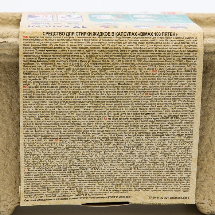 Капсулы для стирки BiMAX 100 пятен, 12шт. в новой биоразлагаемой упаковке. Новая активная концентрированная формула эффективно справляется с пятнами, защищает волокна ткани и дарит приятный, нежный аромат. Безупречная чистота и мягкий аромат цветочной свежести.