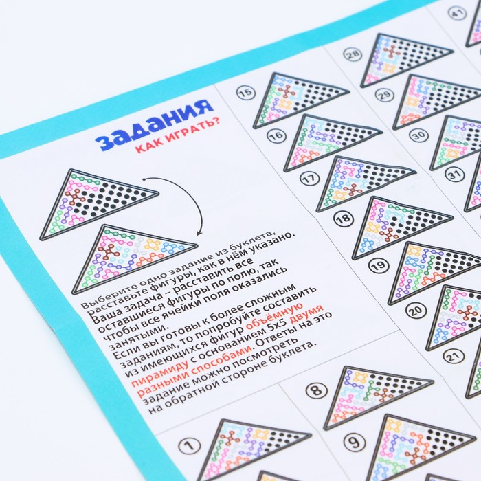 Игрок выбирает одно из заданий в буклете и расставляет цветные фишки, как в нём указано. А теперь самое трудное! Нужно заполнить оставшимися фигурами свободные поля головоломки.