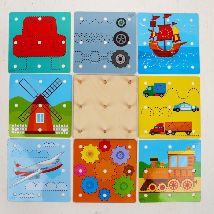 Геоборд представляет собой плоское поле (обычно в форме квадрата или прямоугольника) с равноудалёнными друг от друга штырьками. Суть игры - создавать различные фигуры, надевая на штырьки резиночки. Сначала предложите малышу повторить схемы из набора, а затем попросите придумать историю и обыгрывать её с помощью резиночек на геоборде.