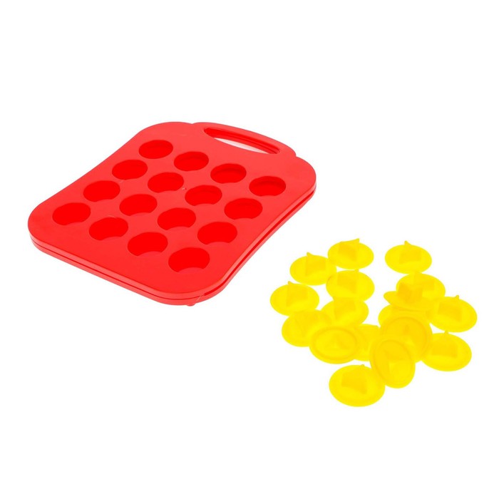 В наборе вы найдёте красный планшет из качественного пластика и 10 двусторонних карточек из толстого картона. На каждой карточке изображены картинки, у каждой из которых есть точная копия: то есть все картинки парные. Выберите одну из карточек, вставьте её в планшет, а все картинки закройте жёлтыми колпачками. Далее игроки по очереди открывают по 2 колпачка за раз. если под ними оказались одинаковые картинки – колпачки нужно взять себе и сделать ещё один ход, если разные – колпачки нужно вернуть на место и передать ход сопернику.