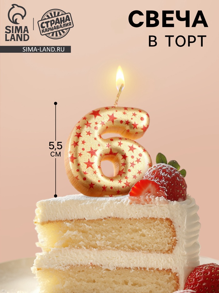Свеча в торт "Саната", цифра "6", золотая с красными звездами, 5,5 см