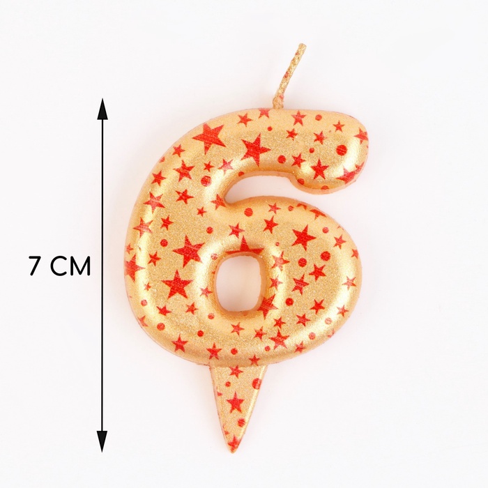 Свеча в торт "Саната", цифра "6", золотая с красными звездами, 5,5 см