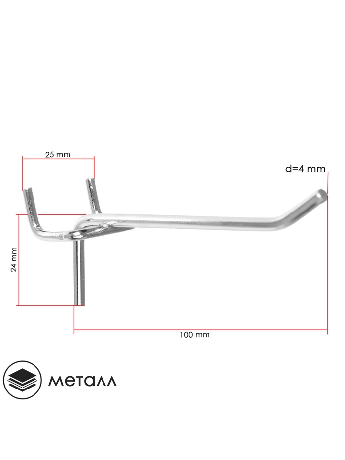 Крючок одинарный для металлической перфорированной панели, L=10, d=4, шаг 25