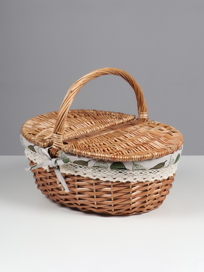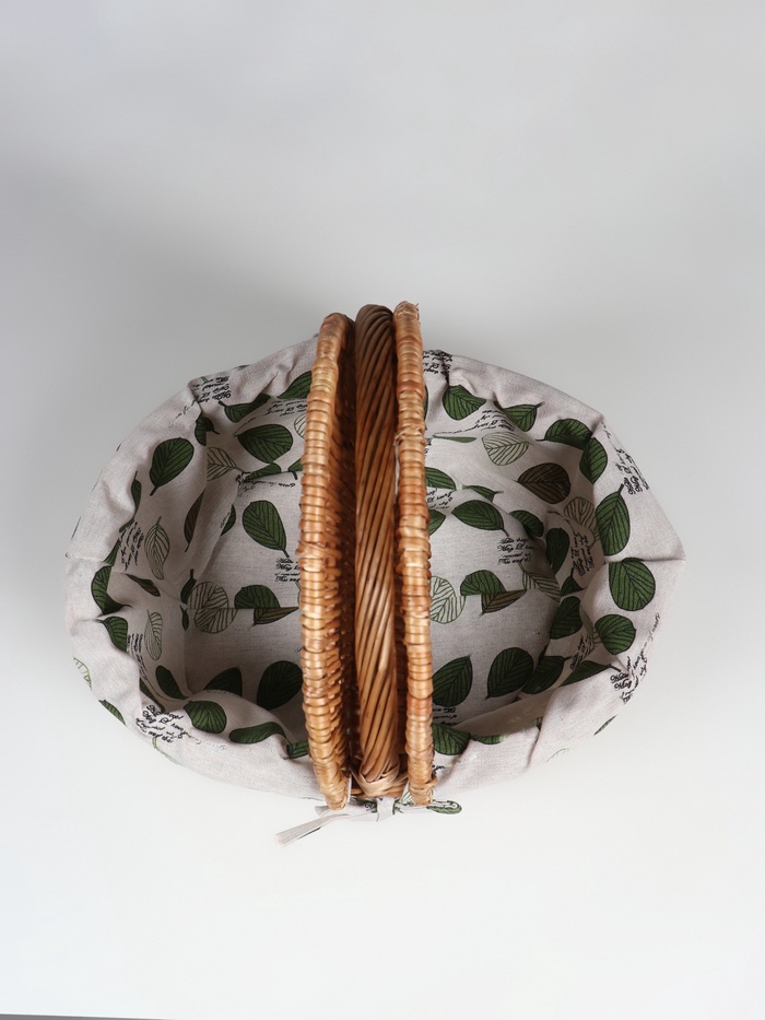 Плетёная корзина-лукошко, ткань внутри, 2е крышки, 35×28 см, высота 14.5 см, высота с ручкой 31 см, дно