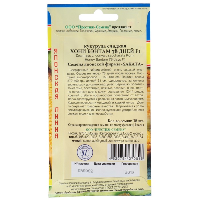 Семена Кукуруза сладкая "Хони Бэнтам 78 дней", F1, 15 шт.