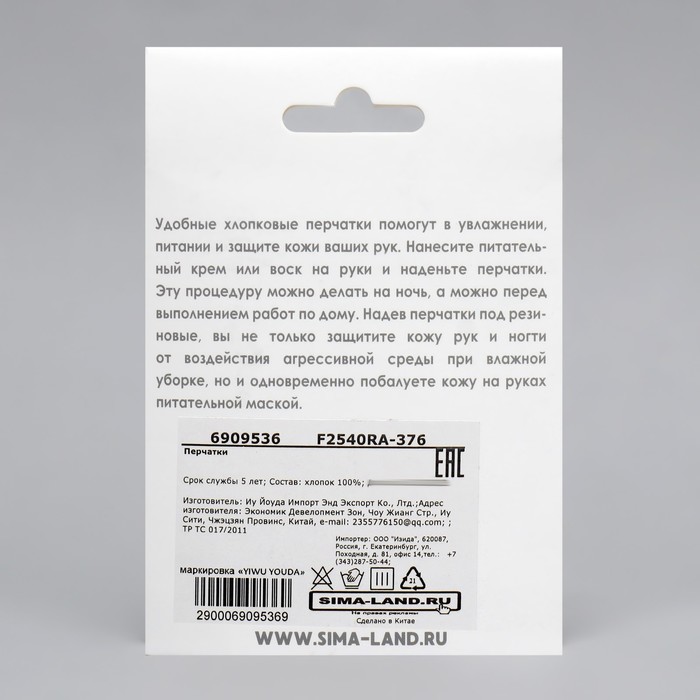 Перчатки изготовлены из натурального хлопка. Они комфортно сидят на руках и пропускают воздух. Надевайте перчатки после нанесения масок, кремов и любых других уходовых средств, чтобы усилить их косметические свойства. Перчатки предназначены для работы с коллекционными предметами, стеклом и для защиты от любых внешних воздействий. Можно использовать несколько раз, подходят для ручной и машинной стирки.