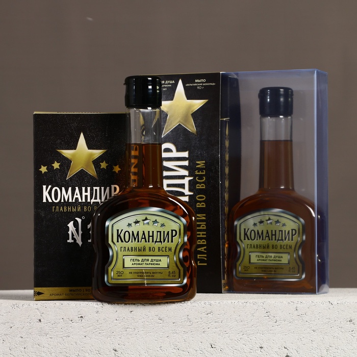 Набор «Командир»: гель для душа во флаконе коньяк, аромат сандал и бергамот, 250 мл; мыло в форме шоколада