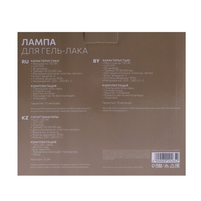 | Комплектация | Маникюрная лампа |