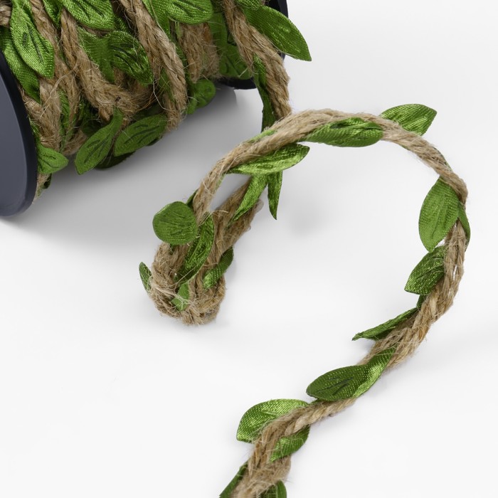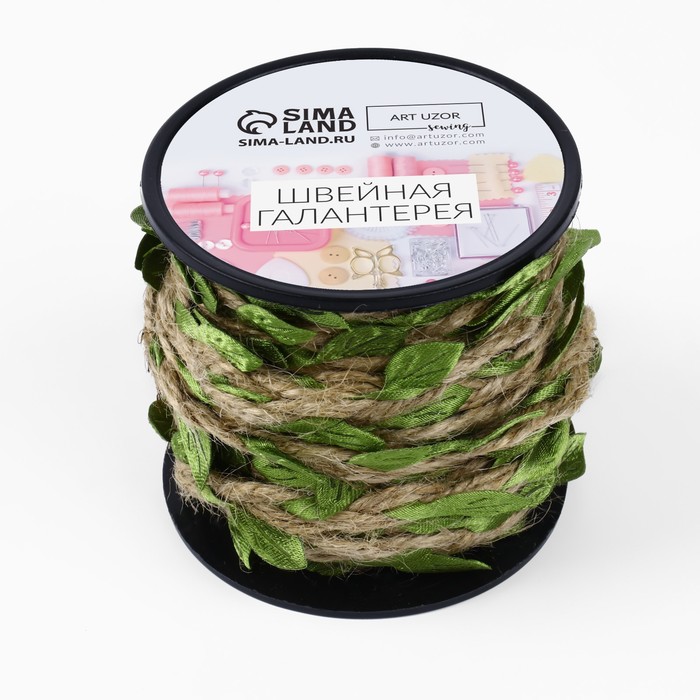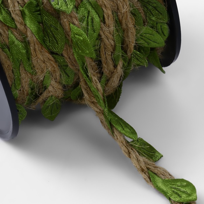 Тесьма декоративная холщовая «Листья», 25 мм, 9±0.5 м, бежевая, зелёная