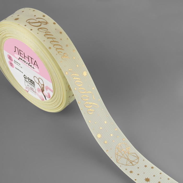 Лента репсовая с тиснением «Вечная любовь», 25 мм, 23 ± 1 м, цвет сливочный/золотой