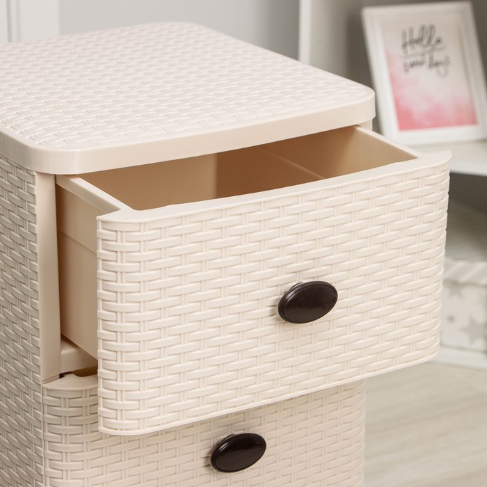С помощью практичного пластикового комода вы правильно организуете хранение вещей. Изделие имеет жёсткую конструкцию за счёт цельных боковых стенок. Отсутствие острых углов делает его безопасным для ребёнка. Комод изготовлен из экологически чистого материала, не содержит вредных веществ.