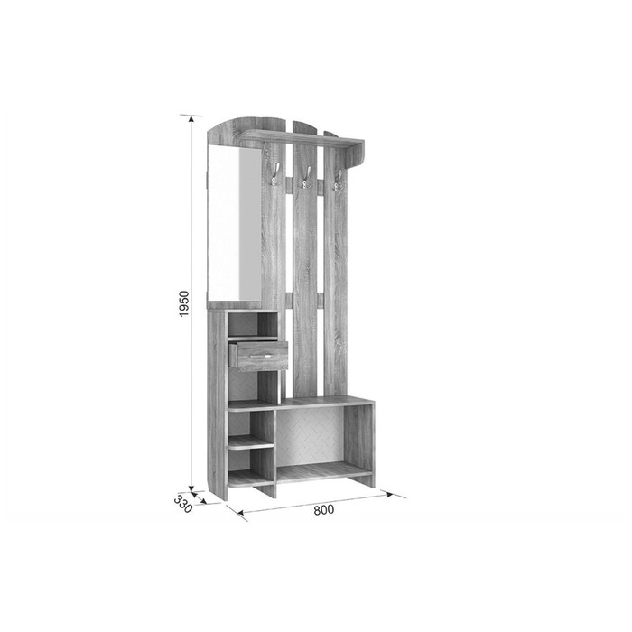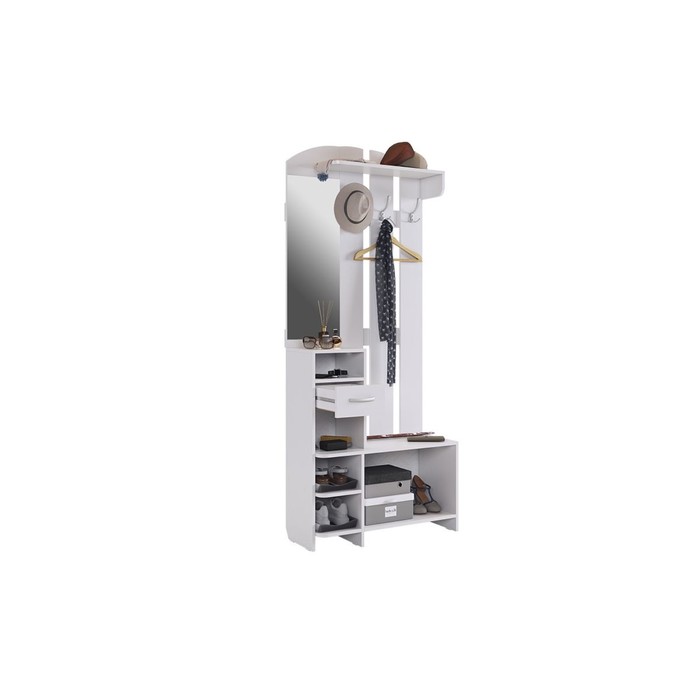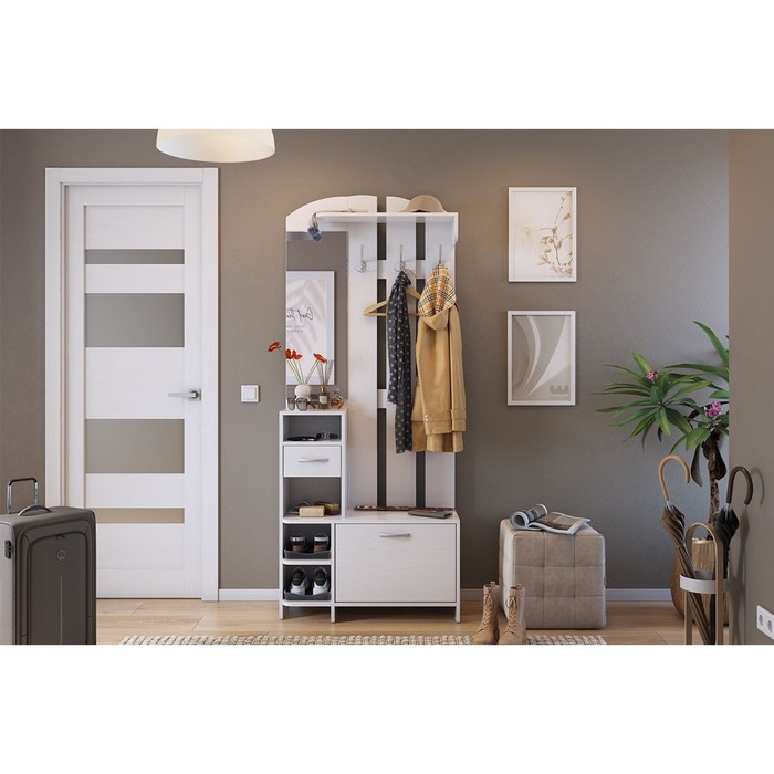Прихожая Мила: эффективное решение для оптимального использования пространства, сочетающее в себе открытую вешалку с крючками, место для обуви, компактное зеркало и удобный ящик с полочками для всевозможных мелочей