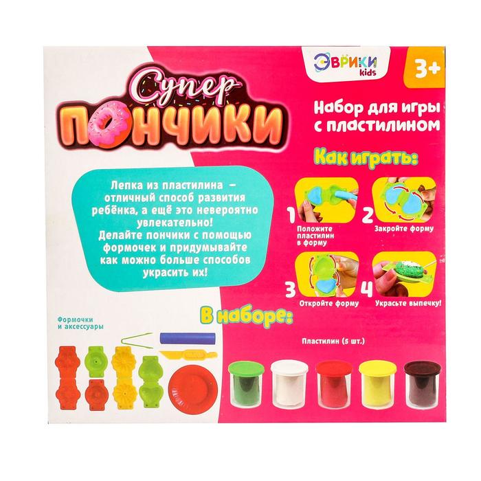 Игровой набор для лепки «Суперпончики» — это волшебный чемоданчик с формочками и пластилином. С ним малыш представит себя кондитером и поэкспериментирует в приготовлении десертов. Из комплектующих получится слепить пирожки, пышки или пряники и разнообразно их украсить.