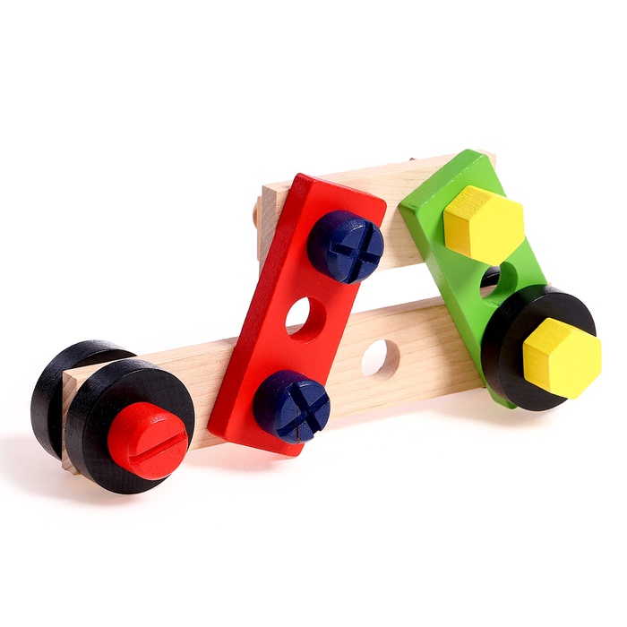 В наборе есть 33 различных элементов и инструментов, таких как молоток, плоскогубцы, винты и т. д. Детали покрыты нетоксичной краской, безопасной для здоровья детей.