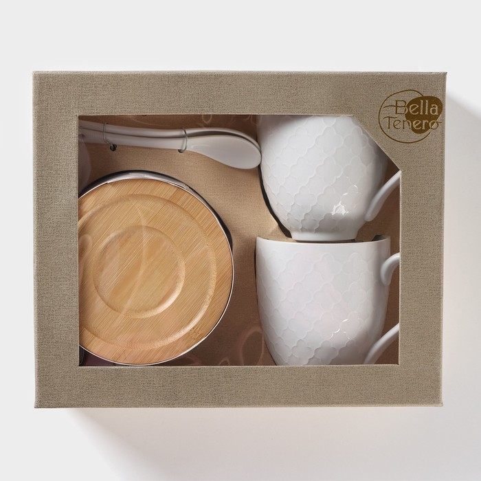 Набор керамический чайный на бамбуковой подставке BellaTenero, 6 предметов: 2 чашки 350 мл, 2 деревянных блюдца d=12 см, 2 ложки, цвет белый