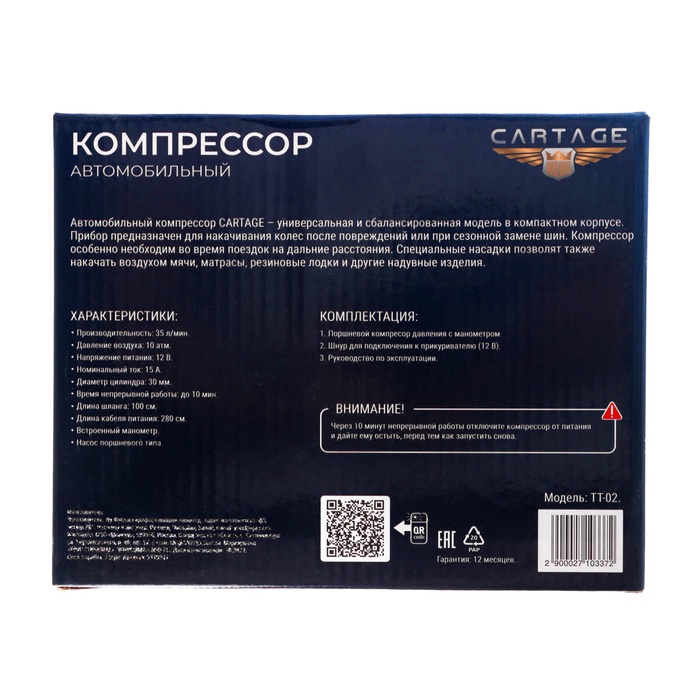 Компрессор автомобильный Cartage, 12В, LED подсветка, 35 л/мин, провод 2.5 м