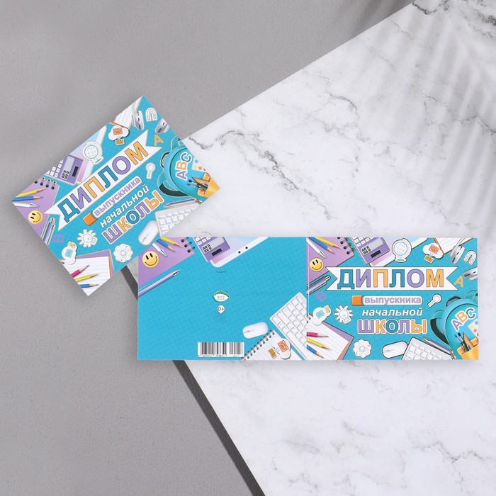 Диплом "Выпускник начальной школы!" термография, голубой фон, школьные вещи, 44,5х16,5 см