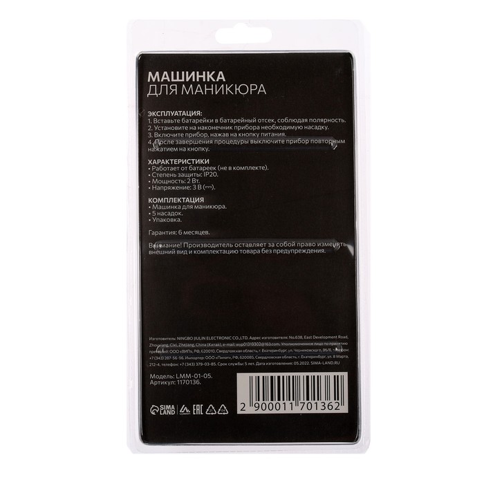 Аппарат для маникюра Luazon LMM-01-05, 5 насадок, 2 Вт, 2хAA (не в комплекте), белый