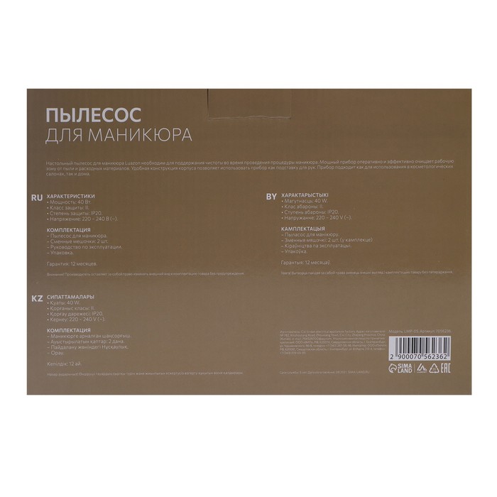 Пылесос для маникюра Luazon LMP-05, 40 Вт, 2700 об/мин, 2 мешочка, 220 В, белый
