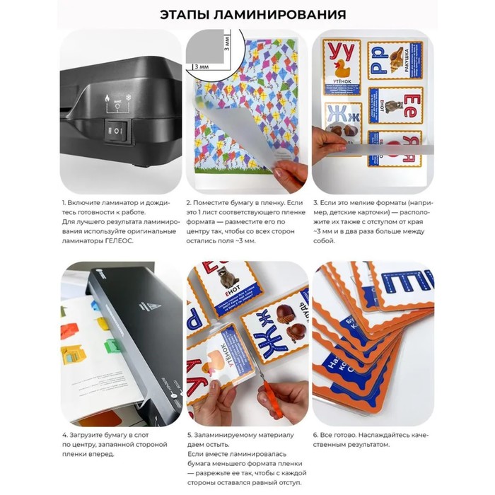 Аппарат для ламинирования сертифицирован и безопасен для использования. Для лучшего результата ламинирования используйте оригинальную пленку ГЕЛЕОС.