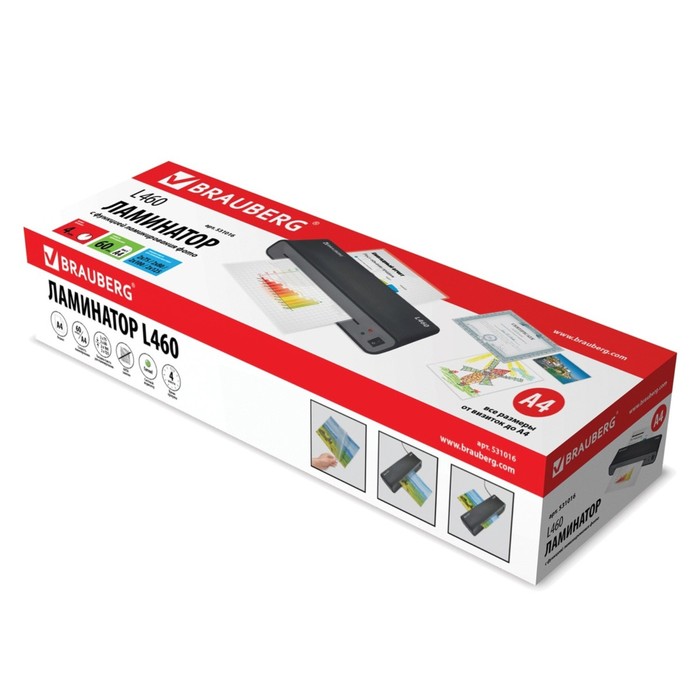 Ламинатор BRAUBERG L460 идеально подходит для использования как в офисе, так и дома. Предназначен для ламинирования документов, меню, рисунков, фотографий и т.д. Способен заламинировать документы различных размеров от визитки до листа формата А4. Ламинирует 1 документ формата А4 в пакетах толщиной 2x75, 2x80, 2x100 и 2х125 мкм за 1 минуту. В ламинаторе присутствует функция "антизамятие", которая реализуется с помощью рычага разжима валов, расположенным с обратной стороны ламинатора, т.е. пользователю нужно одной рукой удерживать рычаг с обратной стороны устройства, а второй рукой потянуть замятый лист на себя. О готовности ламинатора к использованию укажет световой индикатор, который загорится зеленым цветом. После чего ламинатор готов для работы с пленками толщиной 2x75, 2x80 мкм. Чтобы начать ламинировать документы, используя пленку толщиной 2x100 и 2х125 мкм и получить хороший результат, рекомендуется подождать еще 3-5 минут после того, как индикатор загорелся зеленым. Размер 65х335х92 мм. Вес нетто - 0,8 кг. Комплектация: - ламинатор;- руководство пользователя; - гарантийный талон.