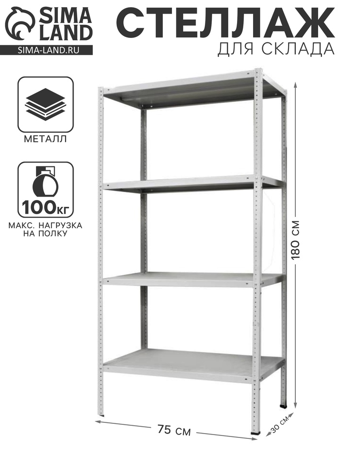 Стеллаж металлический для склада напольный ПАКС металл МС-183, 4 полки, 180×75×30 см, серый