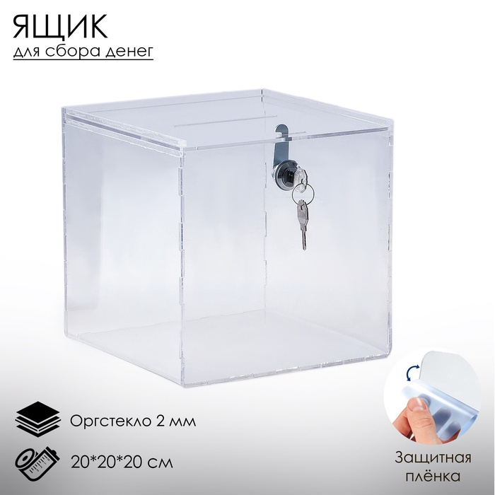 Ящик для сбора денег с врезным замком, отверстие 100x4мм, оргстекло 2 мм, 20x20x20 см. В ЗАЩИТНОЙ ПЛЁНКЕ