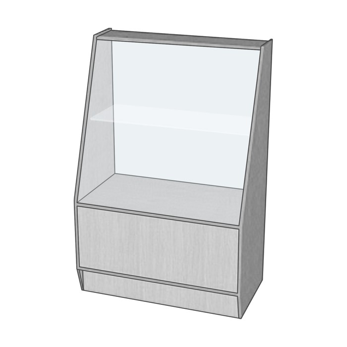 Витрина имеет одну стеклянную полку и накопитель без дверок. Материал: ЛДСП.