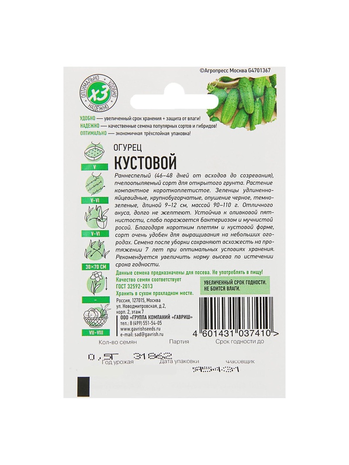Семена Огурец "Кустовой", раннеспелый, пчелоопыляемый, 0,3 г серия ХИТ х3