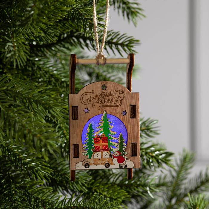 Ёлочная игрушка «Сани с Дедом Морозом и машиной», от батареек, свечение RGB