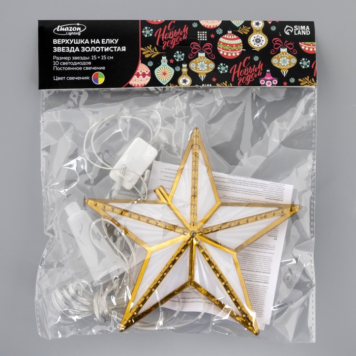 Светодиодная верхушка на ёлку «Звезда золотистая» 15 см, 10 LED, провод 2 метра, 220 В, свечение мульти